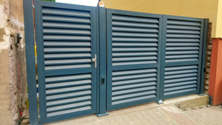 Garážová vrata a pohony > Fotogalerie > Branka a dvoukřídlá brána, antracit, Žaluziová výplň.jpg