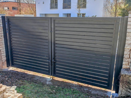 Garážová vrata a pohony > Fotogalerie > Dvoukřídlá brána manuální, lamely, celohliník.jpg