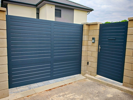 Garážová vrata a pohony > Fotogalerie > Křídlová brána, branka, lamely, celohliník, antracit.jpg