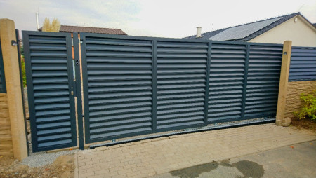 Garážová vrata a pohony > Fotogalerie > Pojezdová brána po kolejnici, branka, žaluziová výplň, antracit,.jpg