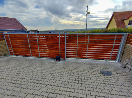 Garážová vrata a pohony > Fotogalerie > Protiběžné kolejnicové brány, pohon Deimos, dřevo.jpg