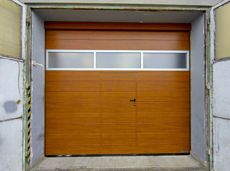 Garážová vrata a pohony > Fotogalerie > Průmyslová vrata s prosklenou lamelou a ID, zlatý dub.jpg