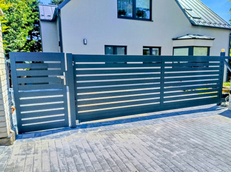 Garážová vrata a pohony > Fotogalerie > Samonosná brána, branka, lamelová výplň, celohliník, antracit.jpg