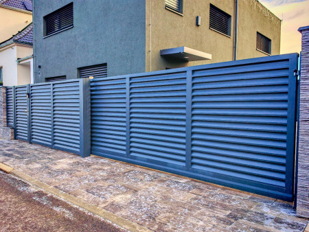 Garážová vrata a pohony > Fotogalerie > Samonosná brána, branka, žaluziová výplň, antracit.jpg