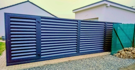 Garážová vrata a pohony > Fotogalerie > Samonosná brána s vloženou brankou, celohliník, žaluziová výplň, antracit.jpg